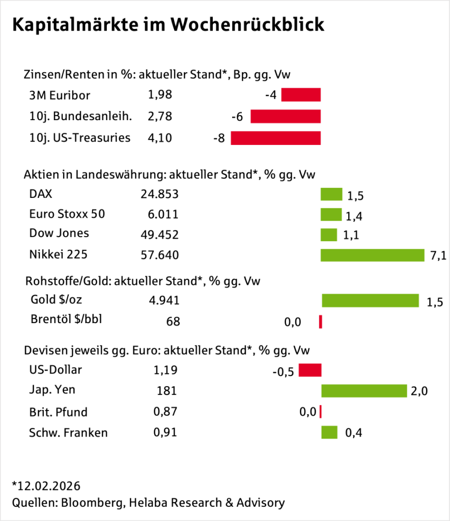 Es war erneut eine vergleichsweise wilde Woche an den Finanzmärkten, deren Achterbahnfahrt sich in der Schlussbilanz jedoch nicht widerspiegelt. Dabei dürften sich sowohl Aktien als auch Renten mit einem Plus aus der abgelaufenen Handelswoche verabschieden, während der US-Dollar zur Schwäche neigt. Auch Gold gewinnt. Für die Anleger war alles dabei: Technologie-Kaufrausch und -Ausverkauf, KI-Sorgen und die Unsicherheit…
