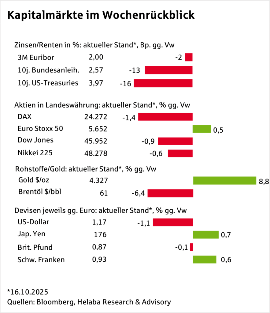 Die Anleiherenditen sind auf Wochensicht deutlich gesunken. Bei den zehnjährigen Bundesanleihen ging es von 2,68 Prozent auf 2,55 Prozent bergab. Die Rendite zehnjähriger US-Treasuries fiel von 4,11 Prozent auf 3,95 Prozent und damit erstmals seit April wieder unter die psychologisch wichtige Marke von 4,0 Prozent. „Die Rentenbullen haben damit eine bedeutende technische Hürde für weitere…