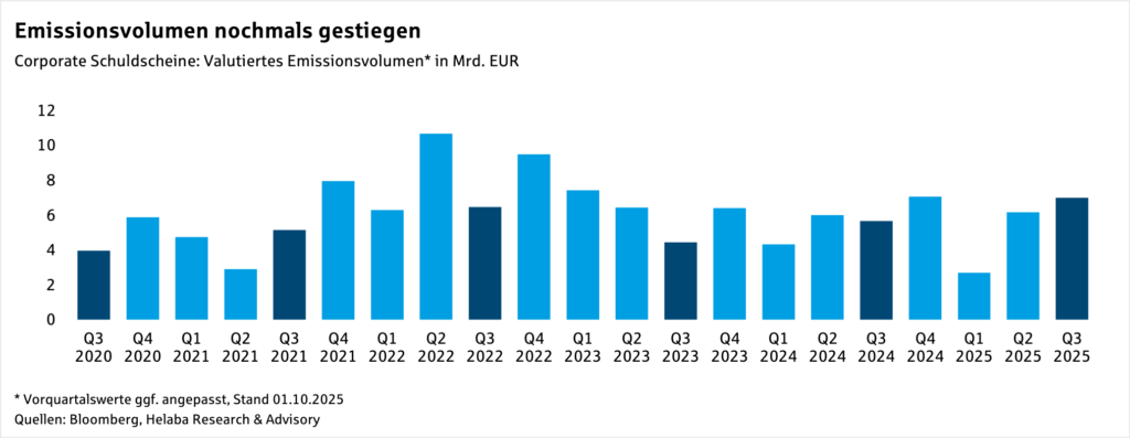In Q3 konnte der Schuldscheinmarkt die dynamische Entwicklung des zweiten Quartals fortsetzen. Stand heute wurden in 33 Transaktionen knapp 7 Mrd. EUR valutiert – rund 800 Mio. EUR mehr als in den Monaten April bis Juni. Allerdings fiel in diesen Zeitraum auch der Schuldschein der Porsche Automobil Holding in Höhe von 1,5 Mrd. EUR, dessen…