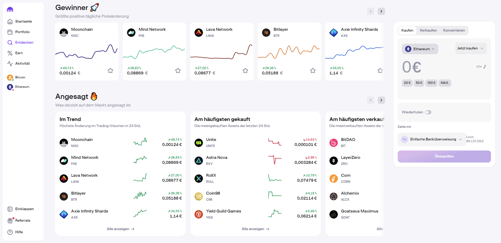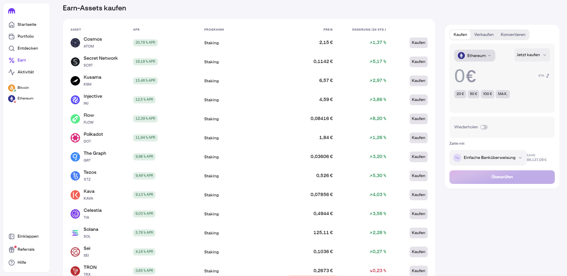 - Direktes Staking von über 20 Proof-of-Stake-Coins
