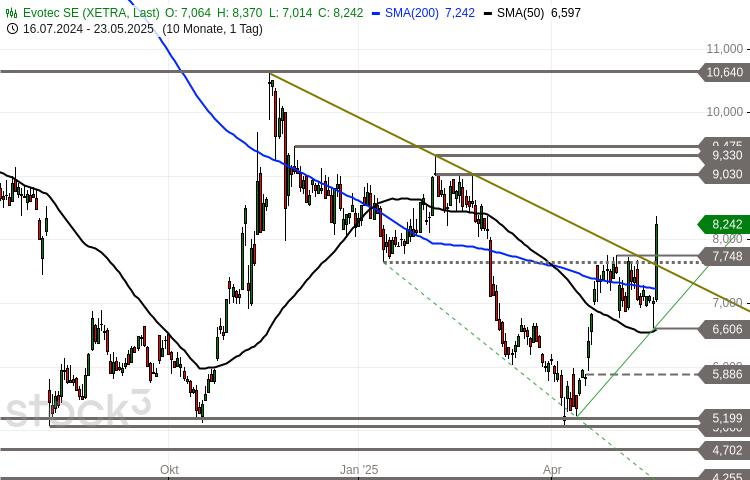 Die im TecDAX enthaltene Aktie des Konzerns Evotec notierte am 07. April 2025 via Xetra auf einem Zwischentief von 5,06 Euro. Seitdem konnte sich die Aktie bis zum 27. Mai 2025 auf ein Zwischenhoch von 8,57 Euro erholen. Zuletzt handelte die Evotec Aktie im Bereich rund um die 5,90 Euro Marke. Aufgrund dieses Kursverlaufs wären…
