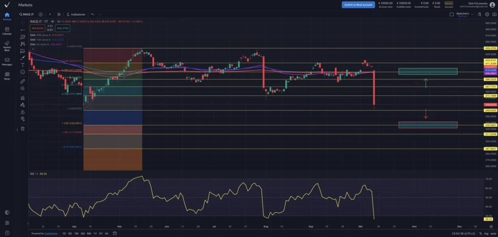 Die erfolgsverwöhnte „Scuderia Ferrari“ vollzog am Donnerstag einen Crash – die Aktie (Symbol im ActivTrader: RACE.IT) schmierte an der Euronext Milano regelrecht ab. Es ging um 15,41 Prozent auf 354,00 Euro abwärts – und Freitag mit dem Gesamtmarkt noch weiter runter (siehe Grafik). Auf Basis dieses Kurses bringt der Produzent der Luxus-Sportwagen eine Marktkapitalisierung in…