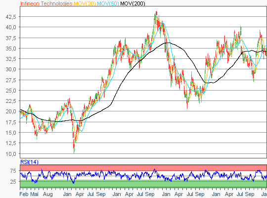 Deutlich abwärts ging es zum Wochenschluß bei Infineon. Zuletzt handelte die Infineon Aktie im Bereich rund um die 33 Euro Marke. Hält diese Marke nicht, dann könnte es schnell Richtung 30,28 Euro gehen, hier befindet sich ein weiteres Wochentief. Auf der Oberseite finden wir die nächsten Widerstände bei 36,72 Euro, 37,10 Euro, 38,84 Euro und…