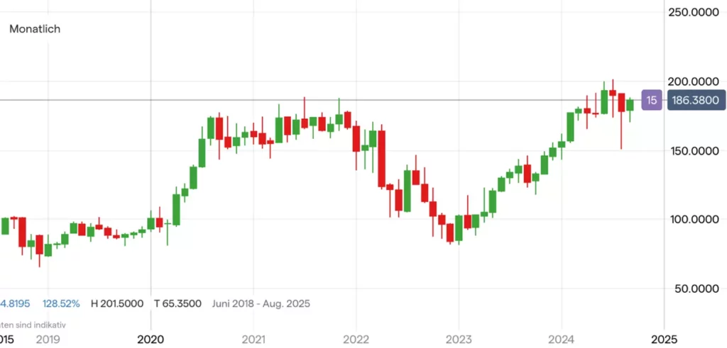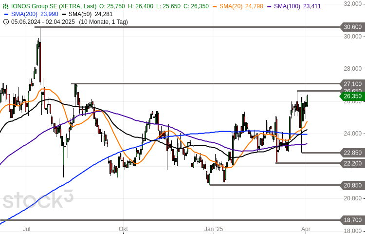 Die Ionos-Aktie (WKN: A3E00M) hatte vom im Oktober 2023 bei 11,92 EUR verbuchten Allzeittief bis auf ein im Juli 2024 bei 30,60 EUR gesehenes Rekordhoch zulegen können. Seither befindet sich das Papier im Korrekturmodus. Nach einer monatelangen Stabilisierung oberhalb des Korrekturtiefs bei 20,85 EUR konnte sich der Wert zuletzt über den rückeroberten Durchschnittslinien der vergangenen…