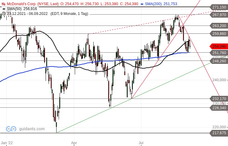 Bis zu einem Rekordhoch von unglaublichen 221,82 US-Dollar im Juli hielt sich das Wertpapier von McDonald’s noch in einem intakten Aufwärtstrend auf. Im August begann das Chartbild jedoch Risse zu …