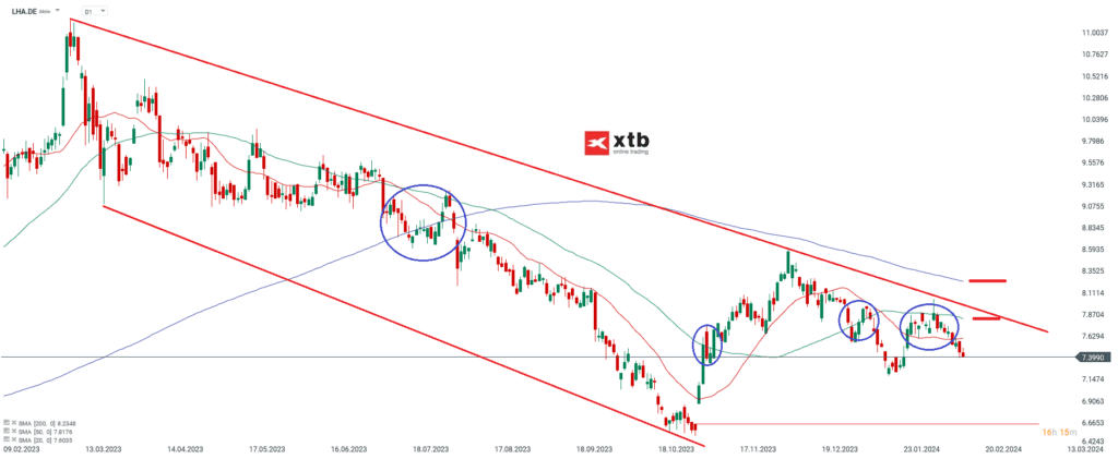 XTB: Das Wertpapier hast sich seit März 2023 bis Oktober 2023 in einem stabilen Abwärtskanal befunden. Seit November 2023 kann sich die Aktie leicht erholen, kommt aber nicht aus der Seitwärtsbox heraus. Lufthansa Aktie Fundamentaldaten: aktueller Preis 7,50 EUR Marktkapitalisierung 8,86 Mrd. EUR Umsatz 2023 32,77 Mrd. EUR Eigenkapitalquote 19,23 %…
