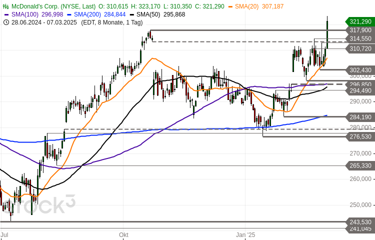 Die McDonaldʼs-Aktie (WKN: 856958) bewegt sich in allen Zeitebenen in einem intakten Aufwärtstrend. Zuletzt das Papier eine mehrmonatige Korrekturphase durchlaufen und dabei einen Rücksetzer an die im August 2024 überwundene 200-Tage-Linie vollzogen. Die anschließende Rally vom im Januar bei 276,53 USD verbuchten Korrekturtief wurde zuletzt im Rahmen einer Seitwärtsbewegung konsolidiert. Mit dem am Freitag der…