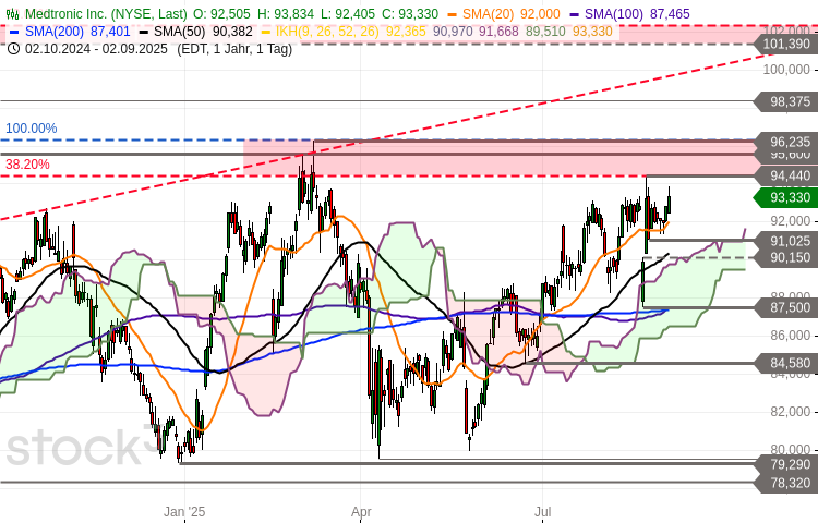 Die Aktie des Medizintechnik-Konzerns Medtronic Inc. (WKN: A14M2J) hatte im September 2021 ein Rekordhoch bei 135,89 USD markiert. Der anschließende Abwärtstrend drückte sie bis auf ein im Oktober 2023 verbuchtes Tief bei 68,84 USD. Das Kursgeschehen oberhalb der dort getesteten langfristig bedeutsamen Supportzone kann als übergeordnete bullishe Trendwende gewertet werden, die im vergangenen August 2024…