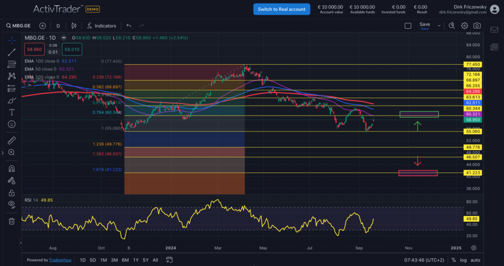 flatex: Die Aktie des DAX-Konzerns Mercedes-Benz notierte am 08. April 2024 via Xetra auf einem letzten hier für die Analyse relevanten Zwischenhoch von 77,45 Euro. Seitdem korrigierte die Aktie bis zum 20. September 2024 auf ein Zwischentief von 54,05 Euro. Zuletzt handelte die Mercedes-Benz Aktie im Bereich von 55,70 bis 59,50 Euro. Aufgrund dieses Kursverlaufs…