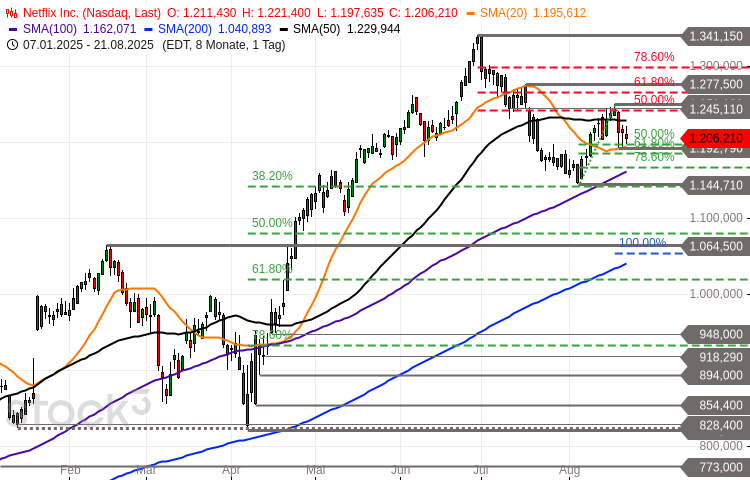 Die Netflix-Aktie (WKN: 552484) konnte oberhalb des im Mai 2022 verzeichneten zyklischen Tiefs bei 162,71 USD einen weiterhin intakten primären Aufwärtstrend etablieren. Dieser katapultierte sie bis auf ein Ende Juni bei 1.351,15 USD markiertes Allzeithoch. Seither korrigiert der Wert den jüngsten Kursschub vom April-Tief und zeigte im Dunstkreis des 38,2%-Fibonacci-Retracements einen mehrtägigen Bounce, der rund…