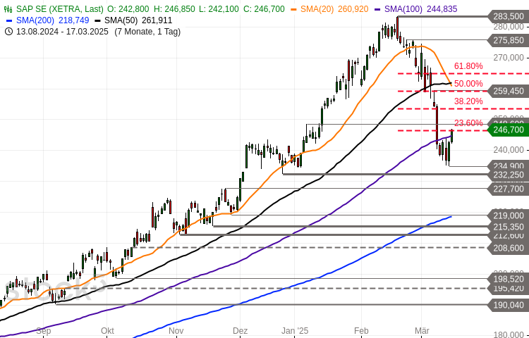 Die SAP-Aktie (WKN: 716460) bewegt sich ausgehend vom im September 2022 bei 79,58 EUR verzeichneten 6-Jahres-Tief in einem intakten primären Aufwärtstrend. Zuletzt markierte sie am 19. Februar ein Rekordhoch bei 283,50 EUR und formte darunter eine bearishe Tageskerze. Im Rahmen der seither laufenden Korrekturphase rutschte der Anteilsschein bis auf ein am 14. März gesehenes 2-Monats-Tief…