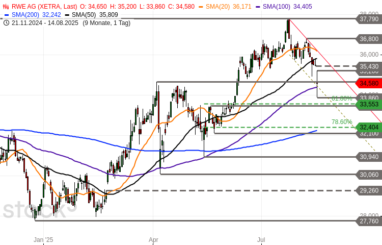 Die Aktie des DAX-Konzerns RWE notierte am 18. August 2020 auf einem letzten Zwischenhoch von 34,99 Euro. Danach korrigierte die Aktie bis zum 20. August 2020 auf ein jüngstes Verlaufstief von 32,14 Euro…