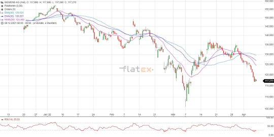 Die Aktie des DAX-Konzerns Siemens notierte am 24. April 2017 auf einem Hoch von 134,18 Euro. Das Wertpapier sank danach schrittweise bis zum 23. Oktober 2018 auf ein Verlaufstief von 98,51 Euro. D…