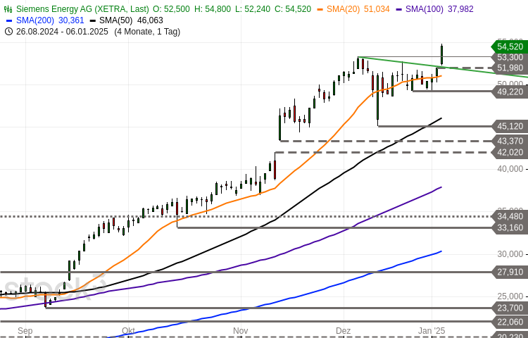 Der DAX stürmte in den Wochenschluss auf neue Allzeithochs, das Erreichen der 21.000er Marke scheint für den deutschen Leitindex nur noch eine Frage der Zeit. Im Windschatten des deutschen Leitindex nimmt nun auch der Überflieger des Jahres 2024 am deutschen Aktienmarkt, Siemens Energy seine Allzeithochs um 55 Euro ins Visier. Das Jahr 2024 hat die…