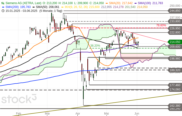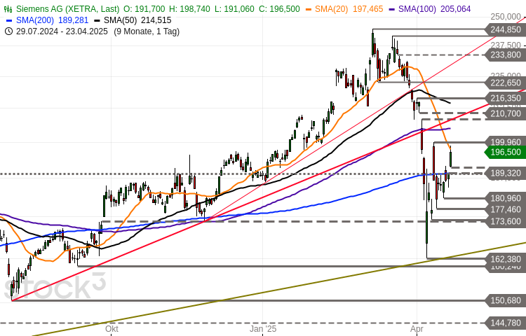 Die Siemens-Aktie (WKN: 723610) befindet sich in einem intakten langfristigen Aufwärtstrend und konnte dabei bis auf ein am 6. März bei 244,85 EUR verzeichnetes Allzeithoch vorstoßen. Der anschließende korrektive Abwärtstrend drückte den Wert in der Spitze um rund 34 Prozent bis auf am 7. April gesehene 162,38 EUR und damit an die primäre Aufwärtstrendlinie vom…