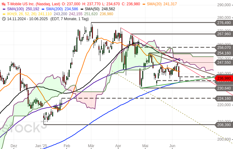 Die Aktie von T-Mobile US (WKN: A1T7LU) bewegt sich in einem intakten langfristigen Aufwärtstrend. Vom Tief im Januar 2022 bei 101,51 USD konnte sie bis auf ein im März dieses Jahres bei 276,49 USD markiertes Rekordhoch ansteigen. Seither befindet sich der Anteilsschein im Korrekturmodus. Oberhalb des im April bei 230,64 USD gesehenen Korrekturtiefs ging er…