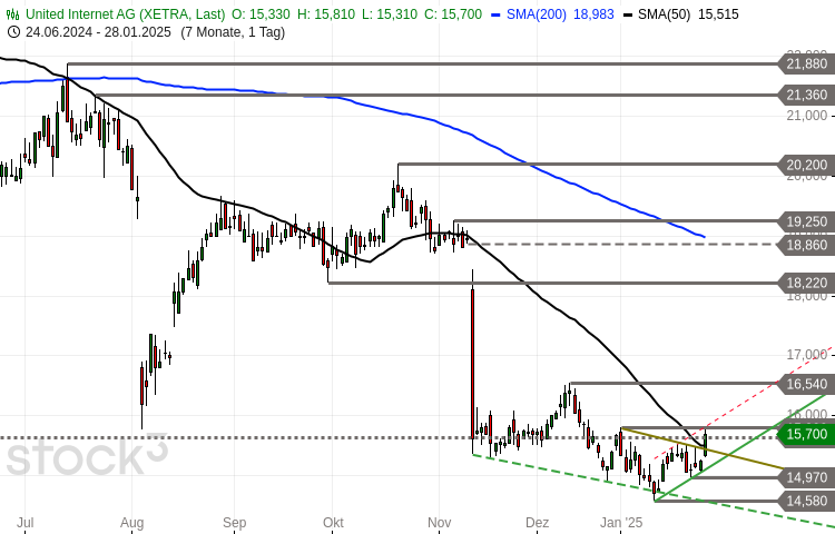 Die Aktie von United Internet (WKN: 508903) hatte nach dem Markieren eines Dekadentiefs bei 12,38 EUR im Juli 2023 eine Rally gestartet, die sie bis auf im Januar 2024 gesehene 25,06 EUR katapultierte. Der nachfolgend etablierte übergeordnete Abwärtstrend ist intakt und führte die Notierung zurück bis auf am 13. Januar dieses Jahres erreichte 14,58 EUR.…