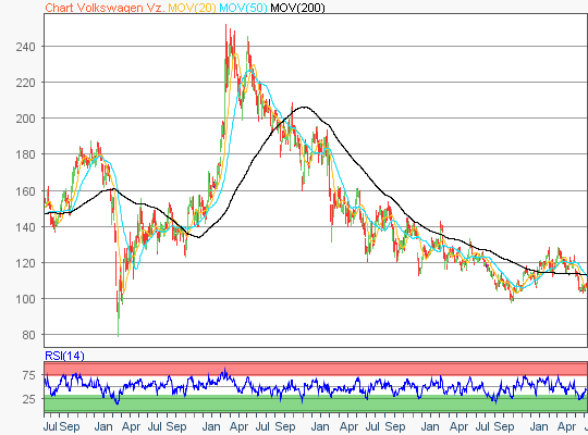 Die Vorzugsaktie des DAX-Konzerns Volkswagen notierte am 23. Januar 2018 bei 192,46 Euro auf einem Hoch. Das Wertpapier fiel seitdem bis zum 25. Oktober 2018 auf ein Verlaufstief von 131,44 Euro. D…