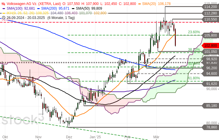 Das Wertpapier (Vorzugsaktie) des DAX-Konzerns Volkswagen notierte am 19. März 2020 auf einem übergeordneten Verlaufstief von 79,38 Euro. Danach erholte sich die Aktie bis auf ein Zwischenhoch vom 08…