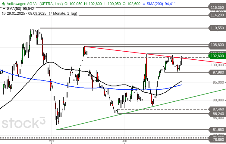 Die Vorzugsaktie des DAX-Konzerns Volkswagen notierte am 22. August 2025 via Xetra auf einem hier für die Analyse relevanten Zwischenhoch von 102,80 Euro. Seitdem korrigierte das Wertpapier bis auf ein Zwischentief vom 02. September 2025 auf 98,10 Euro. Zuletzt handelte die Volkswagen Aktie im Bereich rund um die 102 Euro Marke. Aufgrund dieses Kursverlaufs wären…