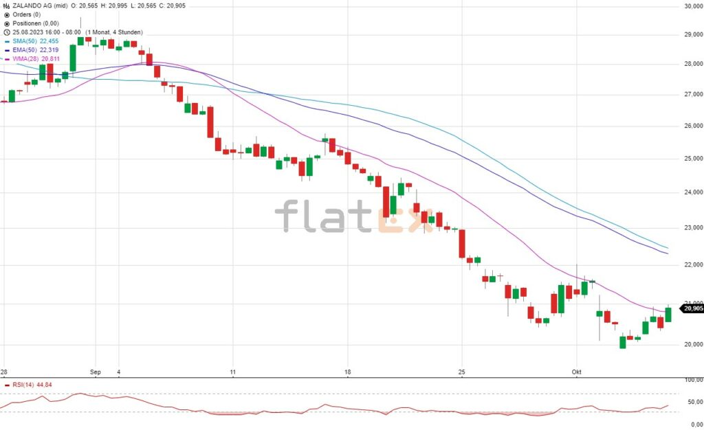 flatex: Die Aktie des DAX-Konzerns Zalando notierte am 27. Juli 2023 auf einem hier für die Analyse relevanten Zwischenhoch von 32,17 Euro. Seitdem korrigierte das Wertpapier bis auf ein Zwischentief vom 04. Oktober 2023 auf 19,89 Euro. In letzter Zeit bewegte sich die Zalando Aktie in südliche Richtung in der Range zwischen 20 und 27…