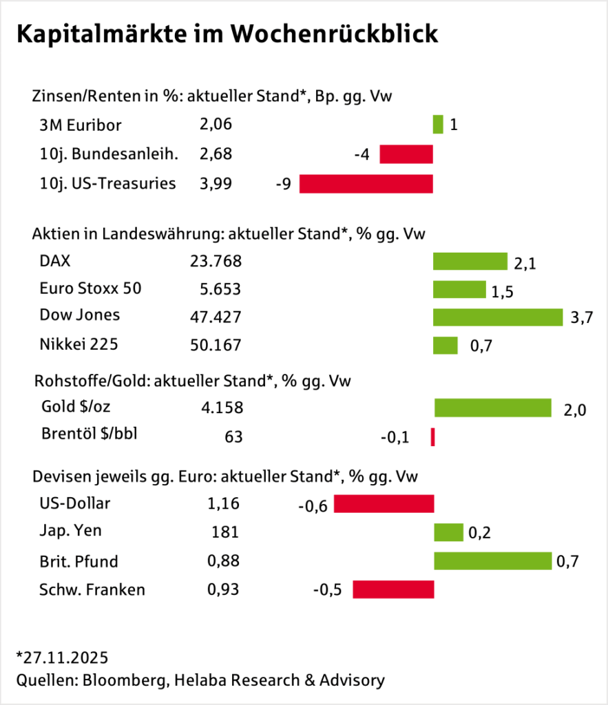 Die Geopolitik steht weiter im Fokus. US-Kriegsschiffe sind vor der Küste Venezuelas in Lauerstellung gegangen. Eine Invasion ist angesichts der militärischen Risiken allerdings nicht zu erwarten. Währenddessen wird um einen Friedensvertrag mit Russland gerungen. Die Hoffnung auf einen Durchbruch hatte zuletzt zur besseren Stimmung an den Aktienmärkten beigetragen. Wichtiger dürften jedoch für die Investoren die Spekulationen über eine Zinssenkung…