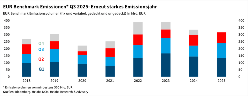 Der Primärmarkt für erstrangig unbesicherte Bankanleihen bleibt auf Rekordkurs. Im 3. Quartal 2025 belief sich das emittierte Volumen trotz der flauen Sommermonate auf insgesamt rund 41 Mrd. EUR. Dies sind zwar 15 % weniger als im 3. Quartal letzten Jahres, aber 25 % mehr als der Durchschnitt der letzten zehn Jahre. In den ersten neun…