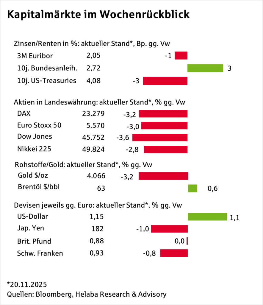Von weihnachtlicher Vorfreude an den Finanzmärkten kann keine Rede sein. Ganz im Gegenteil: Die ablaufende Handelswoche hinterlässt viele Verlierer. Trotz positiver Quartalszahlen des Tech-Riesen Nvidia konnten Aktien nicht zulegen. Zum Wochenausklang ist der deutsche Leitindex DAX sogar temporär unter die Marke von 23.000 Punkten gerutscht (Wochenschluß bei 23.092). Auch hat die gestiegene Risikoaversion…