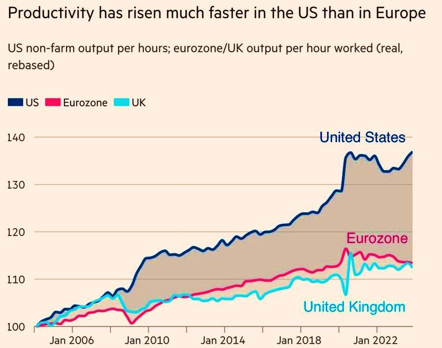 Nicht nur in den Sozialen Medien hat sich eine heftige Debatte über die wirtschaftliche Zukunft Europas neu entfacht. Die grundlegende These lautet dabei, daß Amerika deshalb wohlhabender sei, weil Bürokratie, Überregulierung und mangelnde Innovation die Produktivität und das Wachstumspotenzial in Europa abwürgen würden. Doch stimmt diese Aussage? Leider ja! Die nachfolgende Grafik untermauert diese Behauptung…