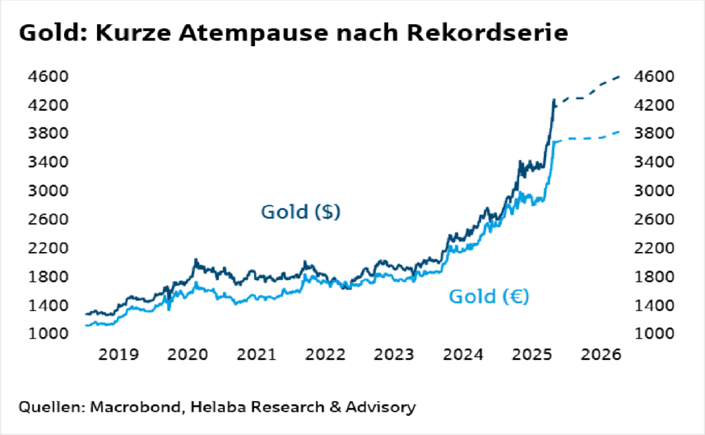 Gold legt seit August eine außergewöhnliche Rekordserie hin. Einen besonders kräftigen Schub hat das Edelmetall in den letzten Wochen nach neuerlichen handelspolitischen Spannungen zwischen China und den USA sowie dem anhaltenden „government shut-down“ und der damit verbundenen Unsicherheit um die US-Fiskalpolitik erfahren. Das hat Gold über die Marke von 4.000 US-Dollar je Feinunze katapultiert. Mit…