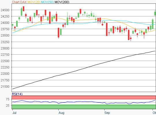 Der Xetra-DAX schloss am Donnerstag mit einem Kursgewinn von 0,20 Prozent und 24.323,58 Punkten. Intraday ergab sich mit 24.481,20 Punkten ein neues Rekordhoch. Das Handelsvolumen via Xetra betrug rund 3,41 Milliarden Euro. Die führenden europäischen Aktienindizes in Amsterdam, London, Madrid, Mailand und Zürich konnten Kursgewinne verbuchen, während der Pariser CAC40 um 0,18 Prozent auf 7.790,27…