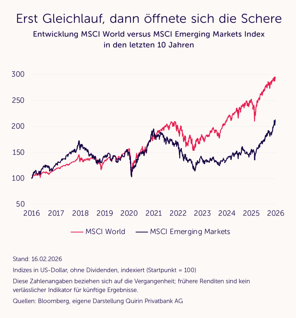 Der MSCI Emerging Markets Index, der die Börsen der wichtigsten Schwellenländer abbildet, hat nach einer fast zwanzigjährigen volatilen Seitwärtsbewegung kürzlich ein neues Allzeithoch erreicht. Emerging-Markets-Aktien waren aufgrund ihrer jahrelangen enttäuschenden Performance vom Radar vieler Investorinnen und Investoren verschwunden. Das ändert sich gerade, denn es gibt gute Gründe, dass sich die zuletzt positive Entwicklung der Schwellenländerbörsen…