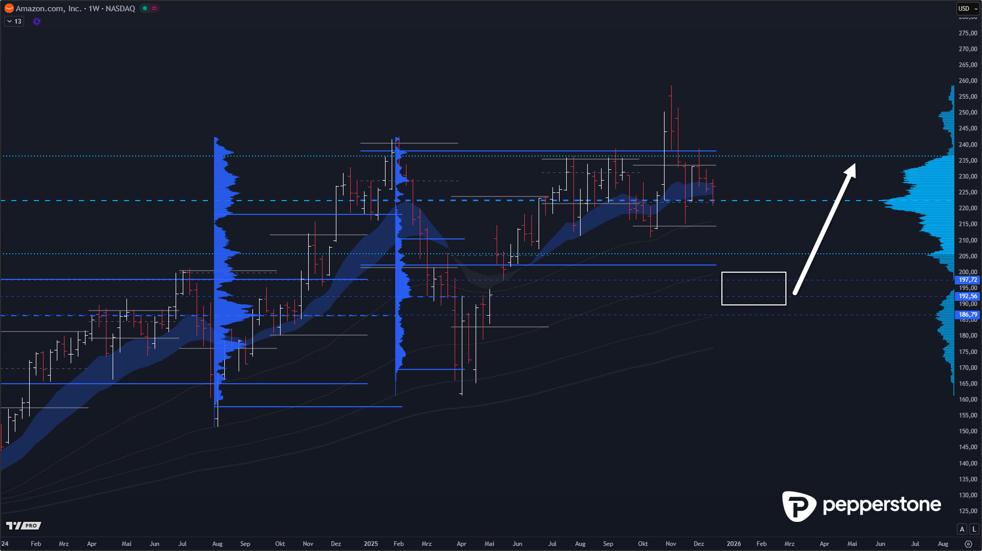 Ein Rücklauf unter die Value Area Low des Vorjahres würde Amazon aus einer unfair bewerteten Zone heraus handelbar machen. Aus Mean-Reversion-Perspektive eröffnet sich dann ein attraktives Chancen-Risiko-Verhältnis: begrenztes Risiko auf der Unterseite bei gleichzeitig klar definierbarem Rücklaufpotenzial zurück in die alte Seitwärtsstruktur.