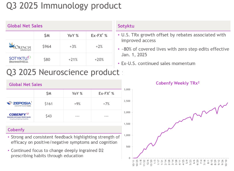 Das offensichtlichste Beispiel ist die Neuropsychiatrie. Der Kauf von Karuna Therapeutics für 14 Milliarden USD verschaffte dem Unternehmen Zugang zu KarXT, das unter dem Namen Cobenfy auf den Markt gebracht und bereits in den USA zur Behandlung von Schizophrenie zugelassen wurde. Der Verkaufsstart im 1. Quartal 2025 wird vom Unternehmen als starker früher U.S.-Start beschrieben, mit positivem Feedback zur Wirkung auf Symptome und kognitive Funktionen.