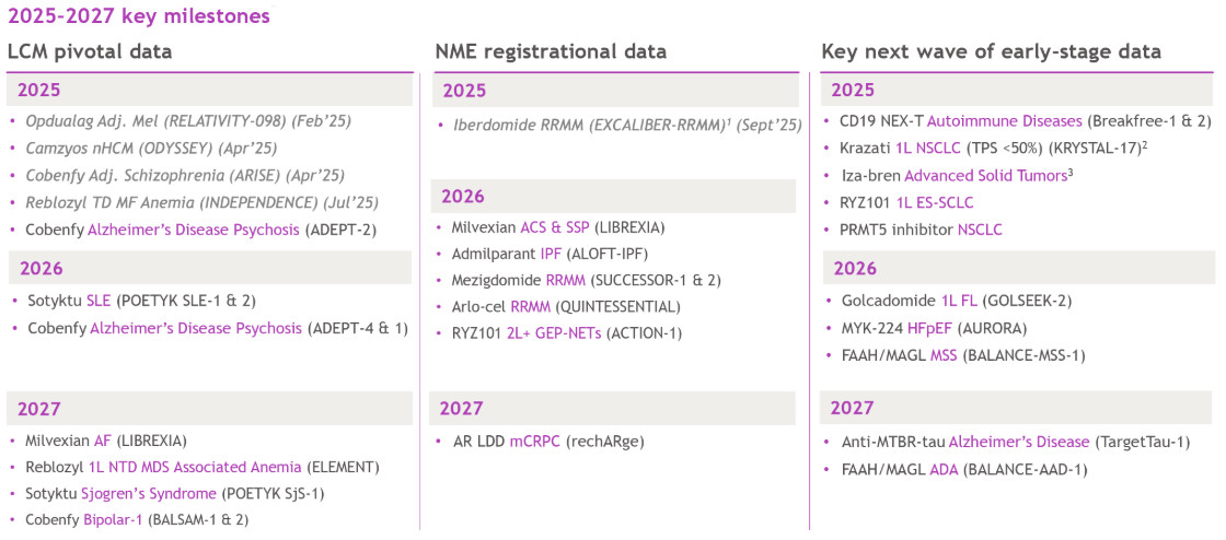 Das Jahr 2025 hat bereits gezeigt, dass der Entwicklungs-Pipeline volatil bleibt: das Scheitern der Milvexian-Studie bei akutem Koronarsyndrom, schwache Ergebnisse einzelner Programme wie Camzyos, Opdualag, Reblozyl und Cobenfy in engen Nischen. Aber die Breite des Portfolios – Onkologie, Kardiologie, Neuro, Immunologie und Radiopharmazie – macht das Unternehmen weniger abhängig vom Ausgang eines oder zweier Programme.