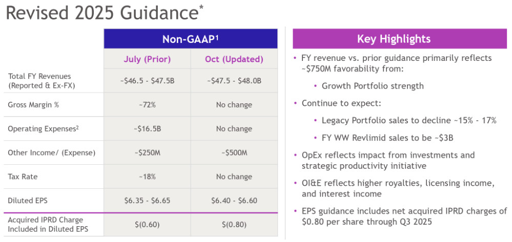 Angesichts dieser Zahlen hob das Management die Umsatzprognose für 2025 auf 47,5–48 Milliarden USD und die EPS auf 6,4–6,6 hervor, wobei betont wird, dass das Upgrade auf die Stärke des Wachstumsportfolios zurückzuführen ist. Wenn das Unternehmen das aktuelle Beat & Raise-Muster ein oder zwei weitere Quartale beibehält, müssen die Analysten die Umsatz- und Gewinnerwartungen für 2026+ nach oben revidieren und den angesetzten LOE-Rückgang reduzieren.