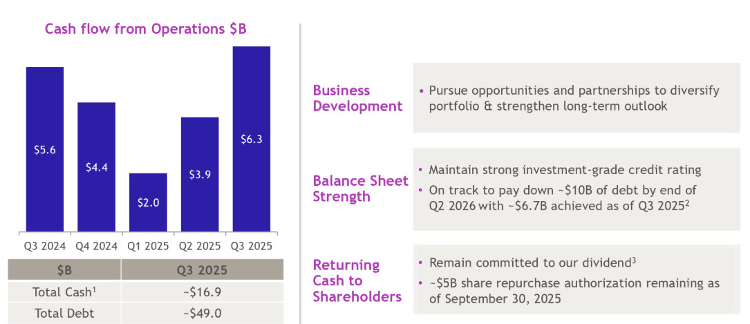 Der operative Cashflow ist stabil: In den letzten vier Quartalen lag er zwischen 2,0 und 6,3 Milliarden USD pro Quartal. Dabei verbleiben dem Unternehmen etwa 5 Milliarden USD aus dem laufenden Aktienrückkaufprogramm und stabile Dividenden.