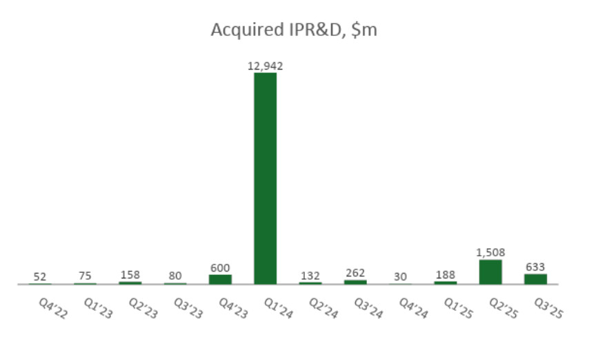 Im 1. Quartal 2024 erkannte das Unternehmen fast 12,9 Milliarden USD solcher Aufwendungen an, und im Jahr 2025 kamen weitere große Blöcke hinzu, darunter 1,5 Milliarden USD im 2. Quartal und 633 Millionen USD im 3. Quartal. Dies sind größtenteils buchhalterische, keine monetären Posten, die die Transaktionen für Karuna, Mirati, RayzeBio und andere Assets widerspiegeln, aber genau sie belasten den Berichtsergebnis und das Bild der retrospektiven EPS-Dynamik.