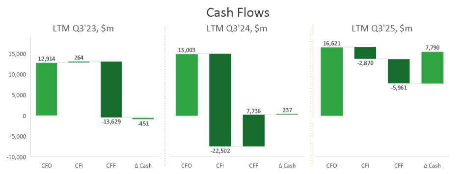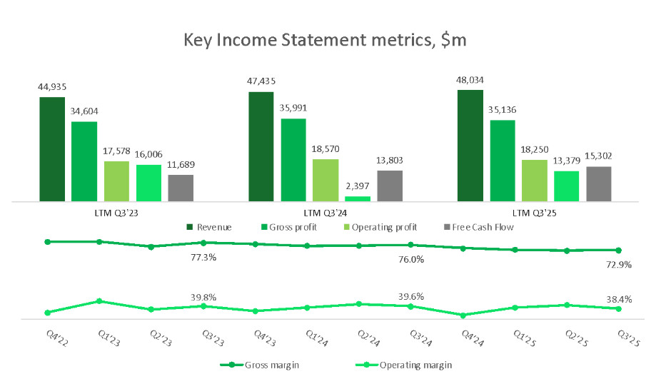 In den letzten drei Jahren hat das Unternehmen die Spitze der Ausgaben für Transaktionen und F&E durchlaufen, aber die grundlegende Wirtschaft des Geschäfts sieht deutlich stärker aus, was aus dem Ergebnisbericht ersichtlich ist. Auf Umsatzniveau sehen wir ein sanftes Wachstum: In den letzten 12 Monaten (LTM) bis Ende des 3. Quartals 2023 erzielte das Unternehmen 44,9 Milliarden USD, im LTM Q3 2024 bereits 47,4 Milliarden USD und im LTM Q3 2025 48,0 Milliarden USD.