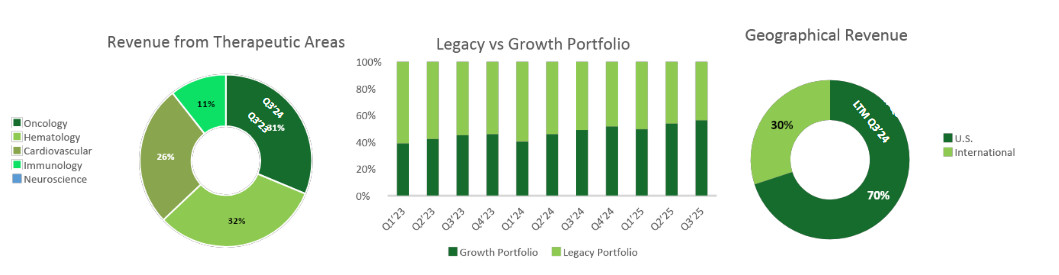 Der Anteil des Wachstumsportfolios wuchs in zwei Jahren von 40%–42% auf 55%–57%, und die Legacy-Produkte reduzierten sich auf weniger als die Hälfte des Umsatzes. Das bestätigt, dass das Unternehmen tatsächlich durch die LOE-Phase geht und es nicht nur in Präsentationen verspricht. Regional bleibt die Struktur stabil: Etwa 69%–70% der Verkäufe entfallen auf die USA und 30% auf internationale Märkte.