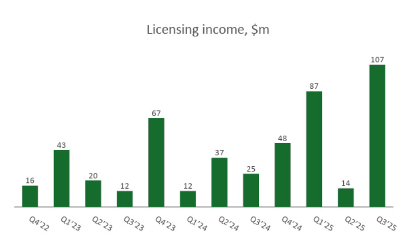 Besondere Erwähnung verdient das Wachstum anderer Einnahmen. Lizenz- und Lizenzgebühren steigen von Dutzenden Millionen pro Quartal in den Jahren 2022–2023 auf über 100 Millionen USD im 3. Quartal 2025.