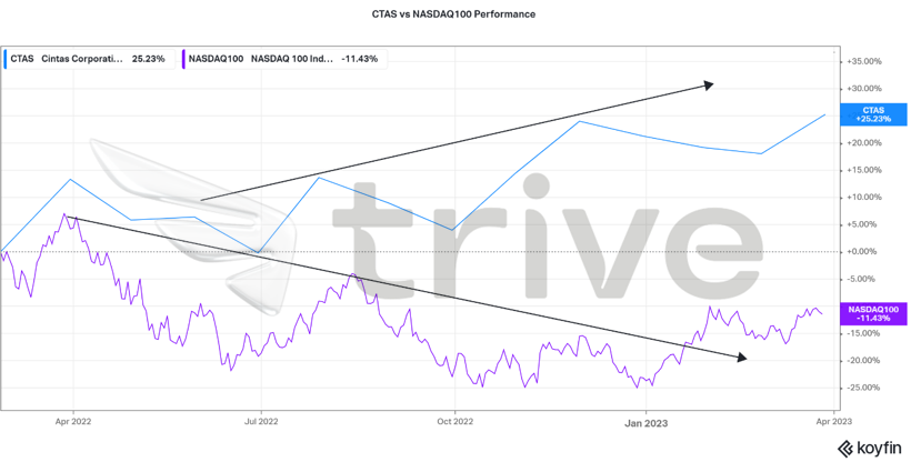 Dies wird in der obigen Abbildung anhand der Kursentwicklung des NASDAQ100 im Vergleich zu Cintas deutlich.