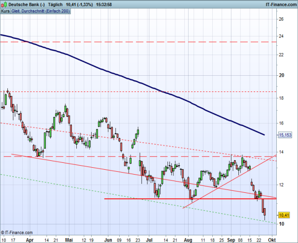 Sollte dieses poenale Worstcase-Szenario im Zuge kommender Verhandlungen nicht signifikant relativiert werden können, würde das Geldinstitut ohne staatliche Unterstützung kaum um eine Kapitalerhöhung herum kommen. Und genau diese Aussicht lässt Anleger das Papier gleich in Scharen verkaufen. Am späten Nachmittag verbilligen sich die Anteilscheine des deutschen Branchenprimus in der Spitze auf 10,185 EUR: neues Allzeit-Tief.