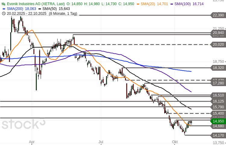 Die Aktie von Evonik Industries (WKN: EVNK01) hatte im März dieses Jahres ein zyklisches Zwischenhoch bei 22,39 EUR ausgebildet und bewegt sich hiervon ausgehend in einem intakten Abwärtstrend.