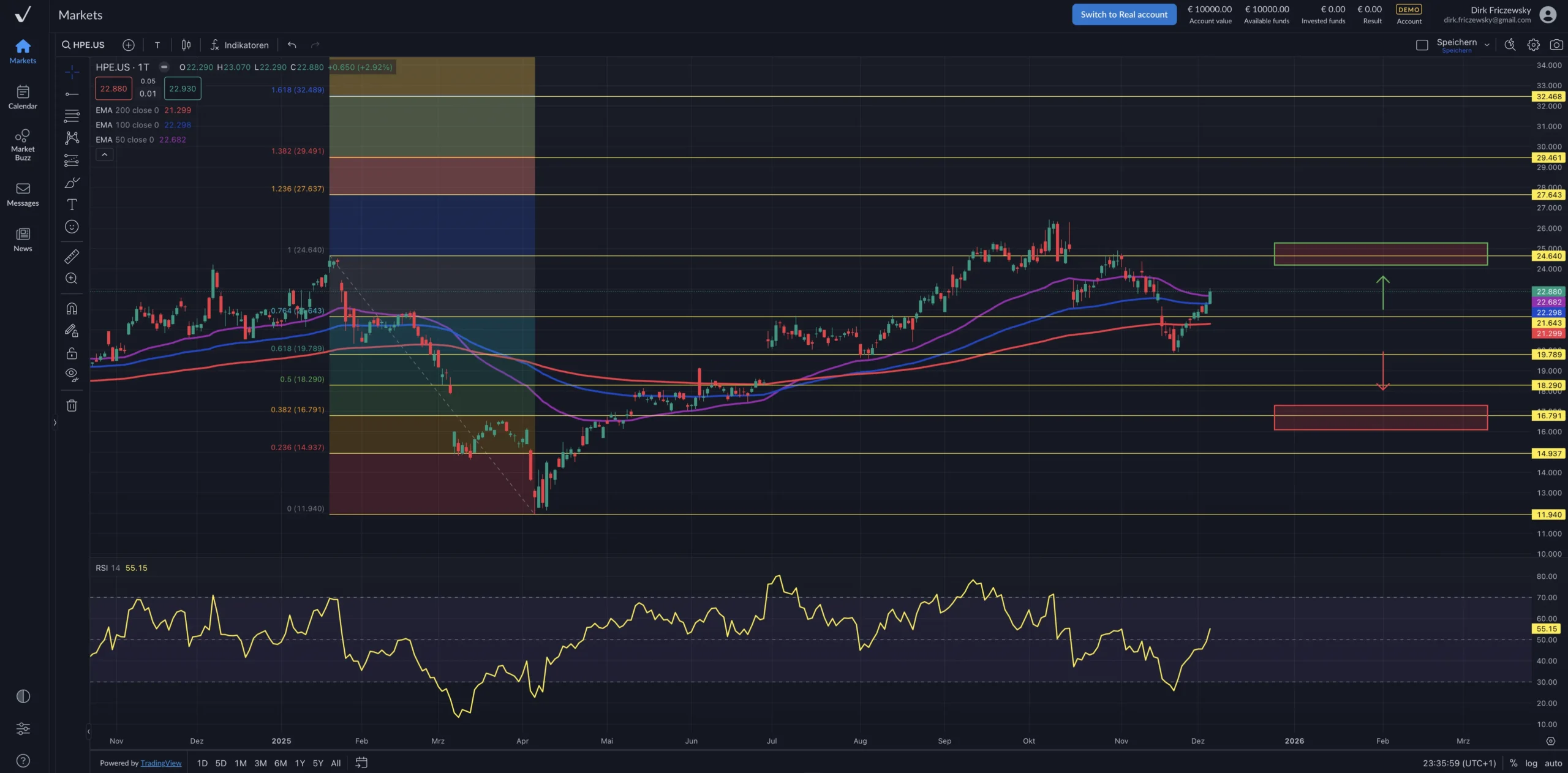 Die Chartanalyse erfolgt hier im Tageschartbild. Als Referenz gilt der CFD auf die an der New Yorker Wertpapierbörse „NYSE“ (New York Stock Exchange) in US-Dollar gehandelte Aktie von Hewlett Packard Enterprise (Symbol: HPE). Der Kursverlauf vom letzten hier für die Analyse relevanten Zwischenhoch des 22. Januar 2025 von 24,640 US-Dollar bis zum Zwischentief des 04. April 2025 von 11,940 US-Dollar, könnte nach wie vor zur Ermittlung der nächsten Ziele zur Ober- und Unterseite heranzuziehen sein – es ist die größte Kursbewegung der letzten Jahre. An diesen beiden Startmarken also könnte eine Fibonacci-Analyse angelegt werden. Die dann von der webbasierten Handelsplattform „ActivTrader“ ausgeworfenen Fibonacci-Retracements und Fibonacci-Projektionen könnten der Ermittlung der künftigen Widerstände und Unterstützungen dienen.