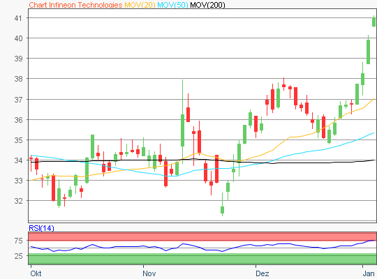 Zuletzt handelte die Infineon Aktie im Bereich rund um die 41,43 Euro Marke.