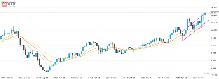 Der Weg bis hierhin war jedoch ein langer und ist von vielen Höhen und Tiefen geprägt. Anfang 2014 brach die Infineon-Aktie erstmals aus einer gut vier Jahre währenden Seitwärtsbewegung mit Notierungen zwischen 5,00 und 8,30 EUR nach oben aus und konnte im Sommer des gleichen Jahres bei einem Kurs von 9,46 EUR ein neues Sechsjahreshoch markieren. Auf die anschließende kräftige Korrektur folgte dann erneut ein Anlauf auf höhere Werte. Im Frühsommer 2015 scheiterte der Titel dann allerdings an dem Widerstand von 12,54 EUR, der noch aus dem Jahr 2007 datierte. Erneut ging es abwärts bis auf 8,50 EUR. Der aktuelle Aufwärtstrend setzte nunmehr im Februar ein.