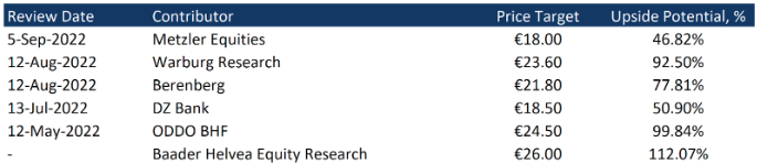 Dem Konsens zufolge liegt der Fair Market Value der Aktie bei 22,70 Euro, was ein Kurspotenzial von 84,34% impliziert.