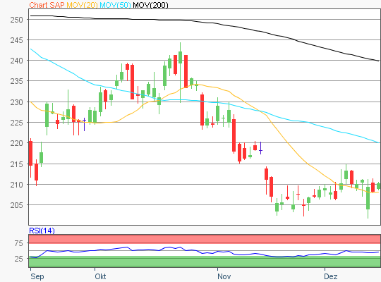 Zuletzt handelte die SAP Aktie im Bereich rund um die 210,45 Euro Marke.