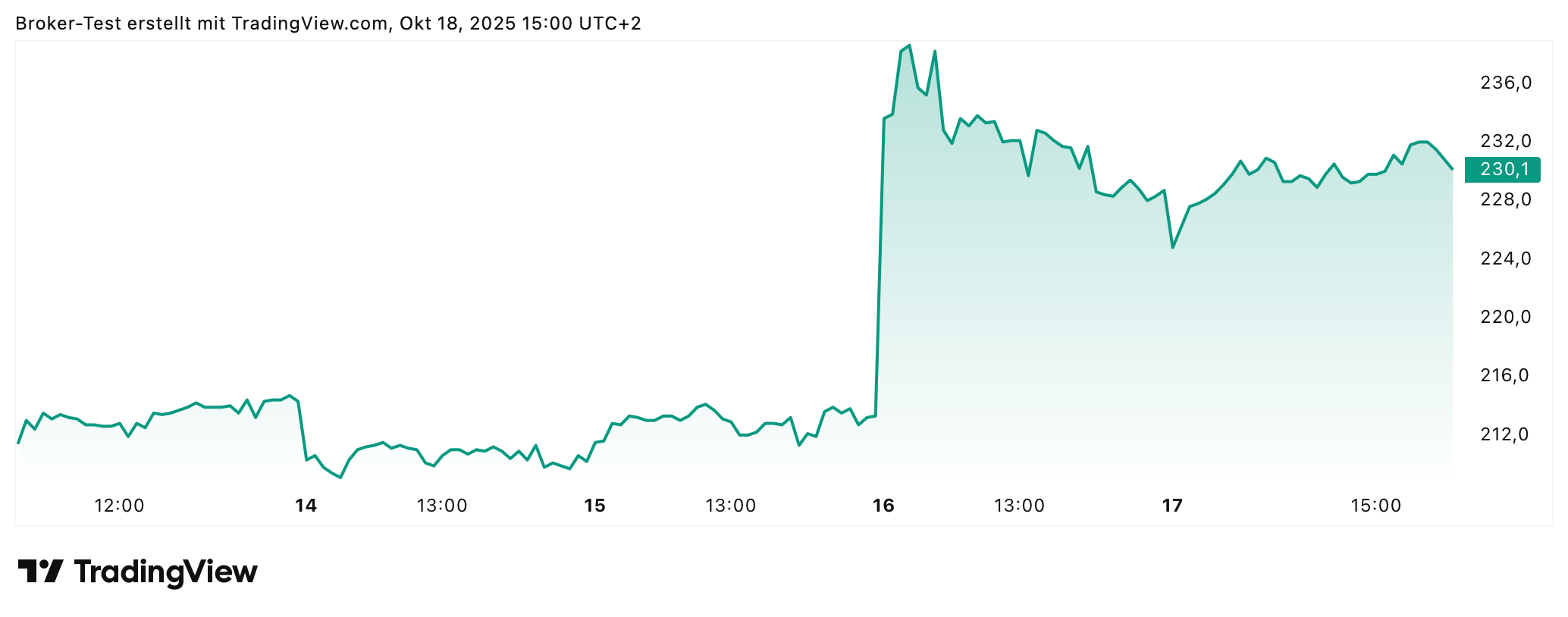 In Reaktion auf positiv aufgenommene Quartalszahlen zeigte die Aktie im Handel am Donnerstag einen von hohem Volumen begleiteten Kurssprung und erreichte in der Spitze ein 7-Monats-Hoch bei 240,50 EUR.